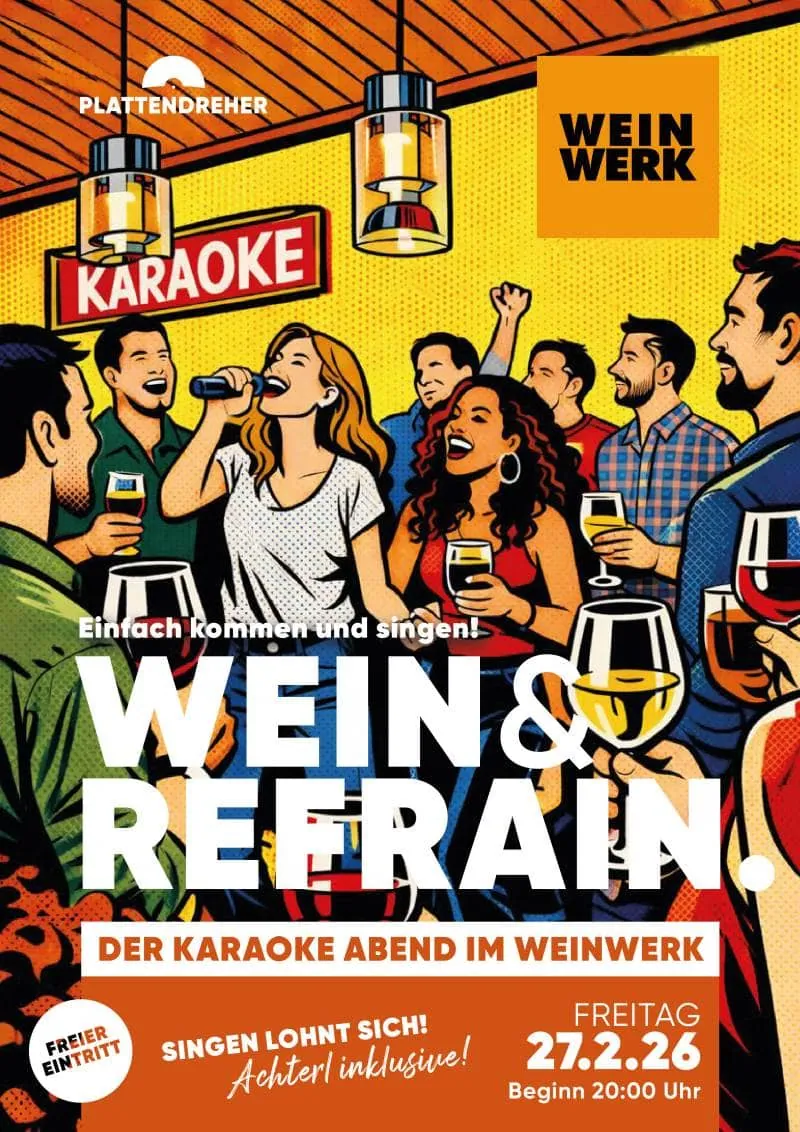 Wer gerne singt – oder es zumindest versucht – ist bei uns goldrichtig. Bei unserer Karaoke Night im Weinwerk heißt es: einfach vorbeikommen, Mikro in die Hand nehmen und loslegen. Der Eintritt ist frei und für alle, die sich trauen zu singen, gibt’s ein Achterl Wein inklusive.